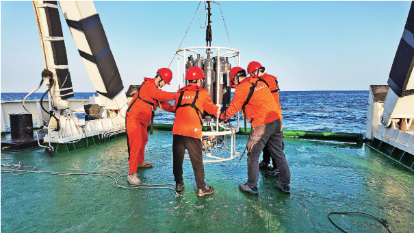 调查队员将 CTD(温盐深仪)采水器回收至后甲板。本报记者 兰圣伟 摄