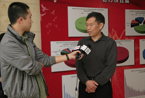 会议休息间隙,国土资源部执法监察局局长李建勤接受中央电视台采访。(杨征 摄 于洪奇编)