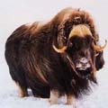 麝香牛属于羊科或羚羊科的动物,长着一对坚硬而永不脱落的犄角,先向外,后往下,再向前,粗大的底部置根于头顶之上,尖利的角尖向上翘起,直指前方,象一把钢叉,使人见了望而生畏。全身披挂着长长的毛发,就象一个巨大的绒球。当一个群体聚在一起时,远远望去象一个个隆起的土丘。它们平时行动缓慢,似乎很是笨拙,但若受到惊扰,就会狂奔起来,风驰电掣,地动山摇。长而多绒的毛发是它们抵御严寒所必需,但也有一种潜在的危险,因为即使在隆冬季节,温暖的气流有时也能带来一场大雨,寒风一吹,它们身上的水球就会渐渐冻成一层厚厚的冰甲,一个个都变成了大冰砣子,动弹不得。