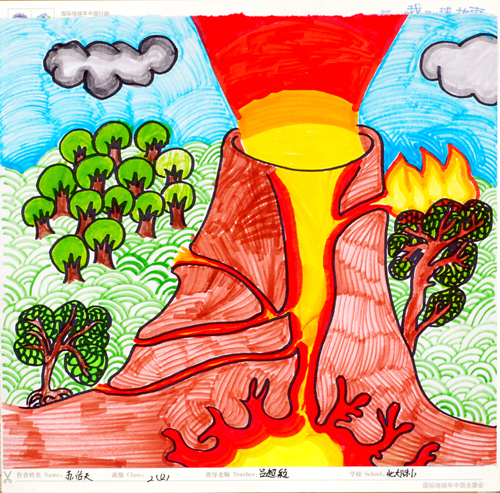 儿童绘画作品:奇妙的火山、 喷发的岩浆。
