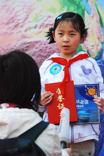 2009年4月22日是第40个“世界地球日”。国土资源部隆重举行“认识地球,保障发展——了解我们的家园深部”主题宣传活动。图为北师大实验小学“李四光中队”学生代表接受记者采访。中国政府网 康丽琳 摄
