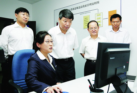 徐绍史、鹿心社察看12336国土资源违法违规举报中心。(李振涛 摄)