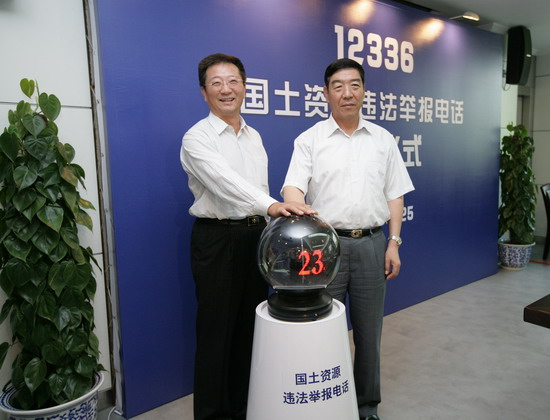 6月25日上午,国土资源部副部长、党组成员贠小苏,工业和信息化部总工程师苏金生共同开通12336国土资源违法举报电话。(李振涛 摄)