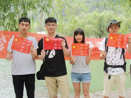 在全国土地日到来之际,河南省修武县国土资源局采取制作小旗、悬挂横幅等多种形式深入景区、县城大街和各乡镇开展土地日宣传活动。图为景区游客在展示国土资源局人员发放的宣传小旗。 周岐学 摄